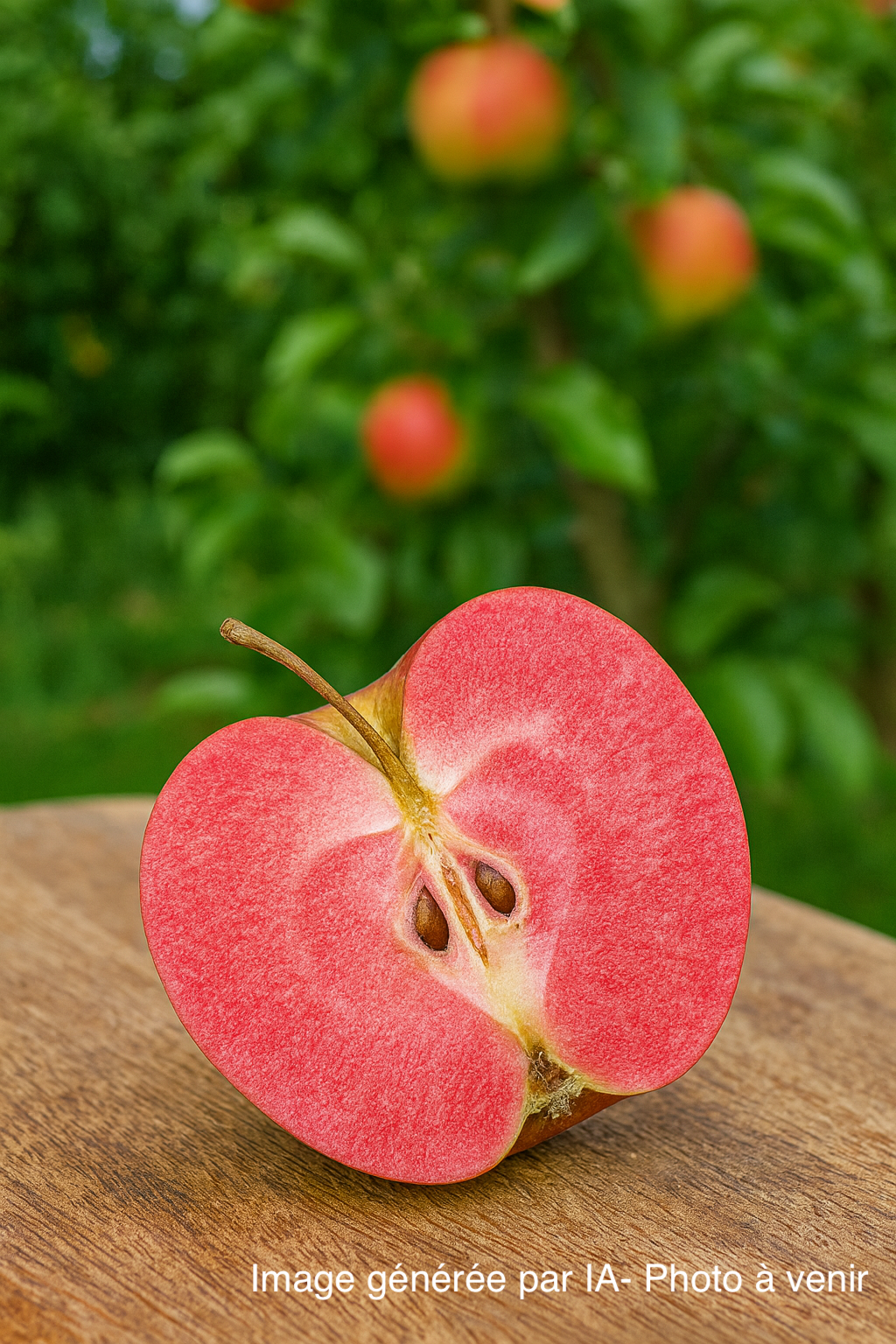 Le pommier ‘Pekacervenca’ est un arbre fruitier donnant de grosses pommes rouges à chair rouge.